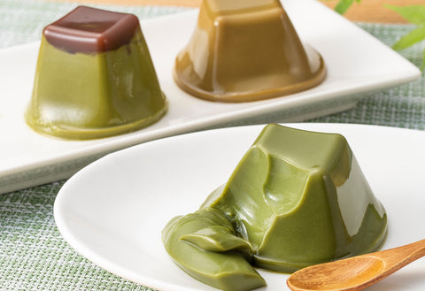 Types of Uji PuddingUsing a healthy tofu-based pudding, three different types of pudding are made. One features authentic matcha from Uji and another uses fragrant stem roasted houjicha tea. The third, Uji Kintoki pudding, (kintoki is another name for red bean paste) boasts an elegant sweetness that combines matcha and adzuki bean paste that goes exceedingly well with matcha.